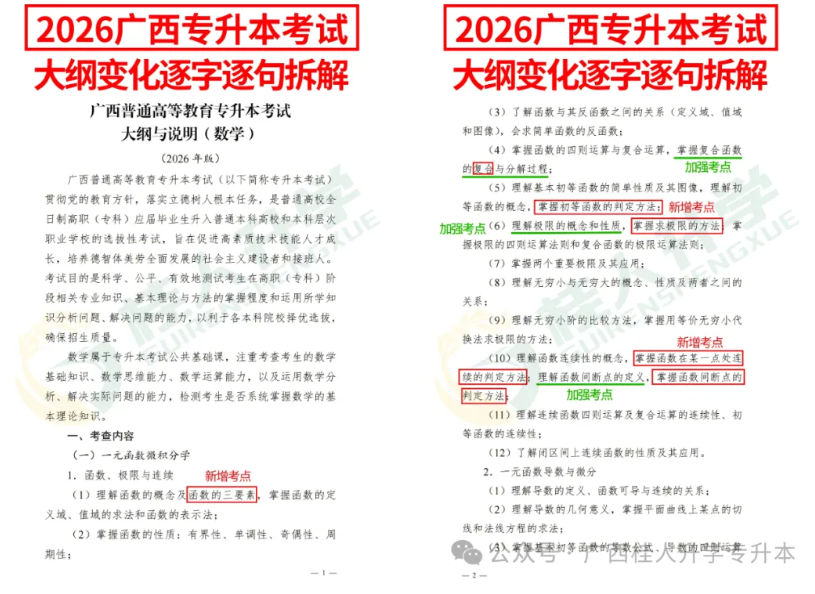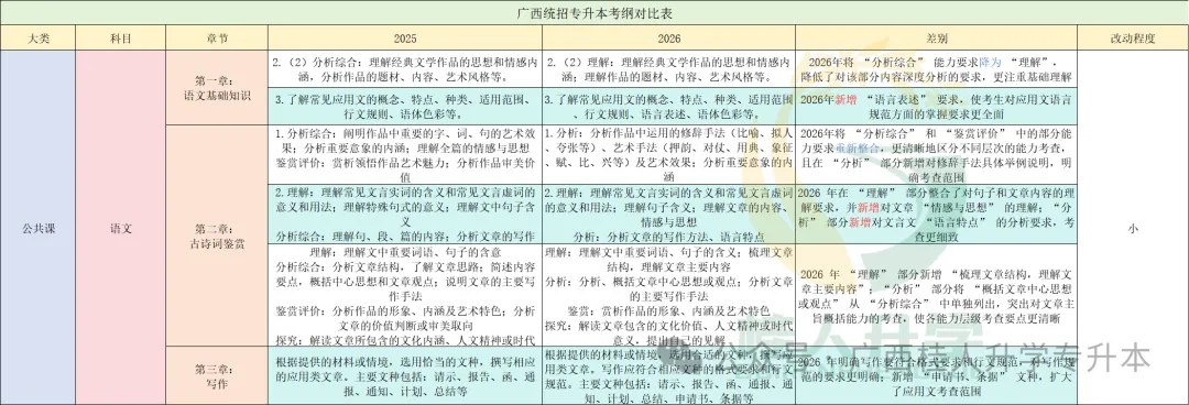 广西桂人升学专升本研究院的老师们已经在紧锣密鼓地进行考纲分析,为大家解读其中的变化和重点。现在,为了帮助大家更好地应对考试,我们特别准备了大纲对比资料。